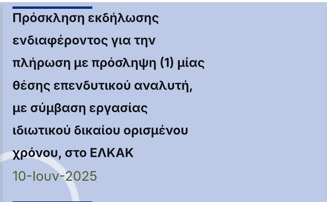Πρόσφατα, το ΕΛΚΑΚ προκήρυξε, δύο φορές μέσα σε έξι μήνες, τη θέση Επενδυτικού Αναλυτή με σύμβαση ιδιωτικού δικαίου ορισμένου χρόνου διάρκειας δύο ετών, με δυνατότητα παράτασης για ένα ακόμη. Πρόκειται δηλαδή για απασχόληση έως τριών ετών το πολύ.