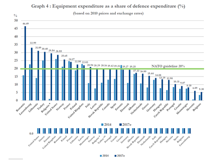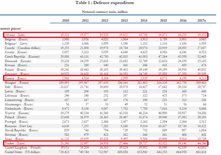 Ο εν λόγω αριθμός είναι ψέμα διότι είναι αδύνατο να συγκρίνουμε το ΑΕΠ της Ελλάδας το οποίο το 2017 ανήλθε στα 299.5 δις ευρώ, με το ΑΕΠ των ΗΠΑ το οποίο το 2017 ανήλθε στα 19.36 τρις δολάρια. Ναι μεν η Ελλάδα δαπανάει το 2,32% του ΑΕΠ, αλλά πόσο είναι αυτό το ποσό σε απόλυτο αριθμό; τι μπορείς να αγοράσεις με αυτά τα χρήματα; Και πόσο επηρεάστηκε αυτός ο αριθμός από την οικονομική κρίση; Αν κοιτάξουμε λοιπόν τον επόμενο πίνακα θα δούμε ότι από το 2010 και μετά το ποσό των αμυντικών δαπανών μειώνεται συνεχώς εξαιτίας της οικονομικής κρίσης, ενώ το αντίστοιχο ποσό για την Τουρκία και την Αλβανία αυξάνεται κατακόρυφα. Μπορεί πρόσφατα ο κος Α/ΓΕΣ να δήλωσε ότι ο Στρατός δεν έχει κρίση, η αλήθεια όμως είναι ότι οι αριθμοί τον διαψεύδουν.