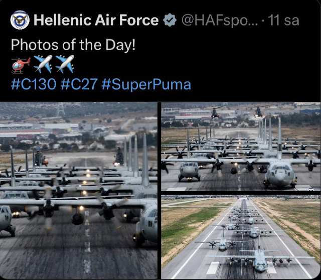 Ο επίσημος λογαριασμός της Πολεμικής Αεροπορίας κοινοποίησε στο τουίτερ (Χ) μια παλιότερη φωτογραφία, με το “elephant walk” μεταφορικών αεροσκαφών C-130 & C-27J στην 112 ΠΜ.