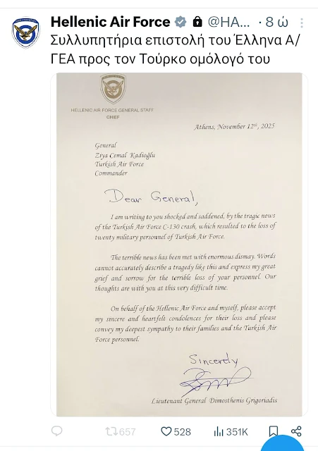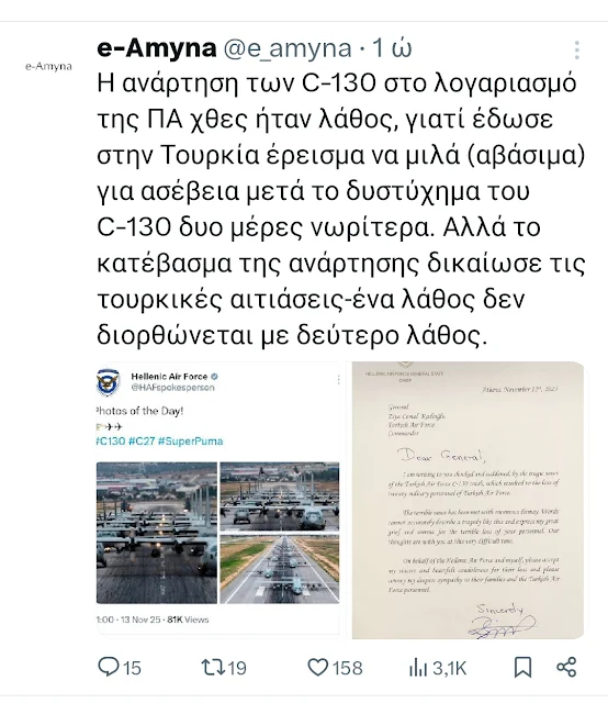 Η ανάρτηση με την κοινοποίηση της ανωτέρω φώτο, έγινε μετά την τραγική συντριβή του τουρκικού C-130. Μετά από τουρκικές αντιδράσεις, η ανάρτηση διαγράφηκε.